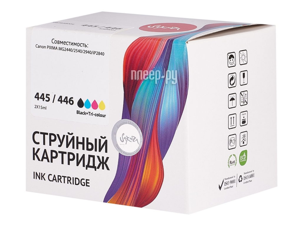 Струйный, схожий с Canon 8283B004. Пигментный + водорастворимый тип чернил. Емкость 8/9 мл. Цвет чернил: мультипак. Ресурс печати 180 страниц. Совместимость: Canon PG-445/CL-446.