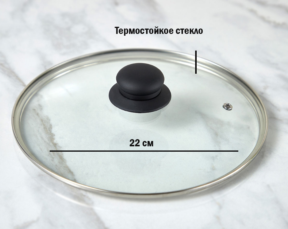 Крышка стеклянная - это высококачественная крышка для вашей кастрюли или сковороды. Она изготовлена из термостойкого стекла, что обеспечивает прочность и долговечность использования. Круглая форма крышки диаметром 220 мм позволяет легко и удобно накрыть кастрюлю или сковороду. Пароотвод на крышке обеспечивает быстрое и эффективное испарение влаги, что помогает сохранить пищу свежей и ароматной.