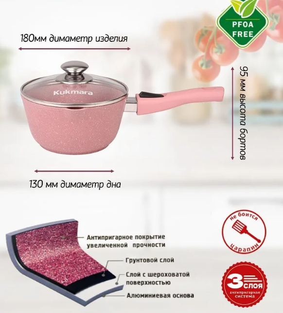 Ковш Kukmara с антипригарным покрытием имеет ровное, проточенное дно, которое обеспечивает максимальное прилегание дна посуды к плите для более быстрого и равномерного нагрева.