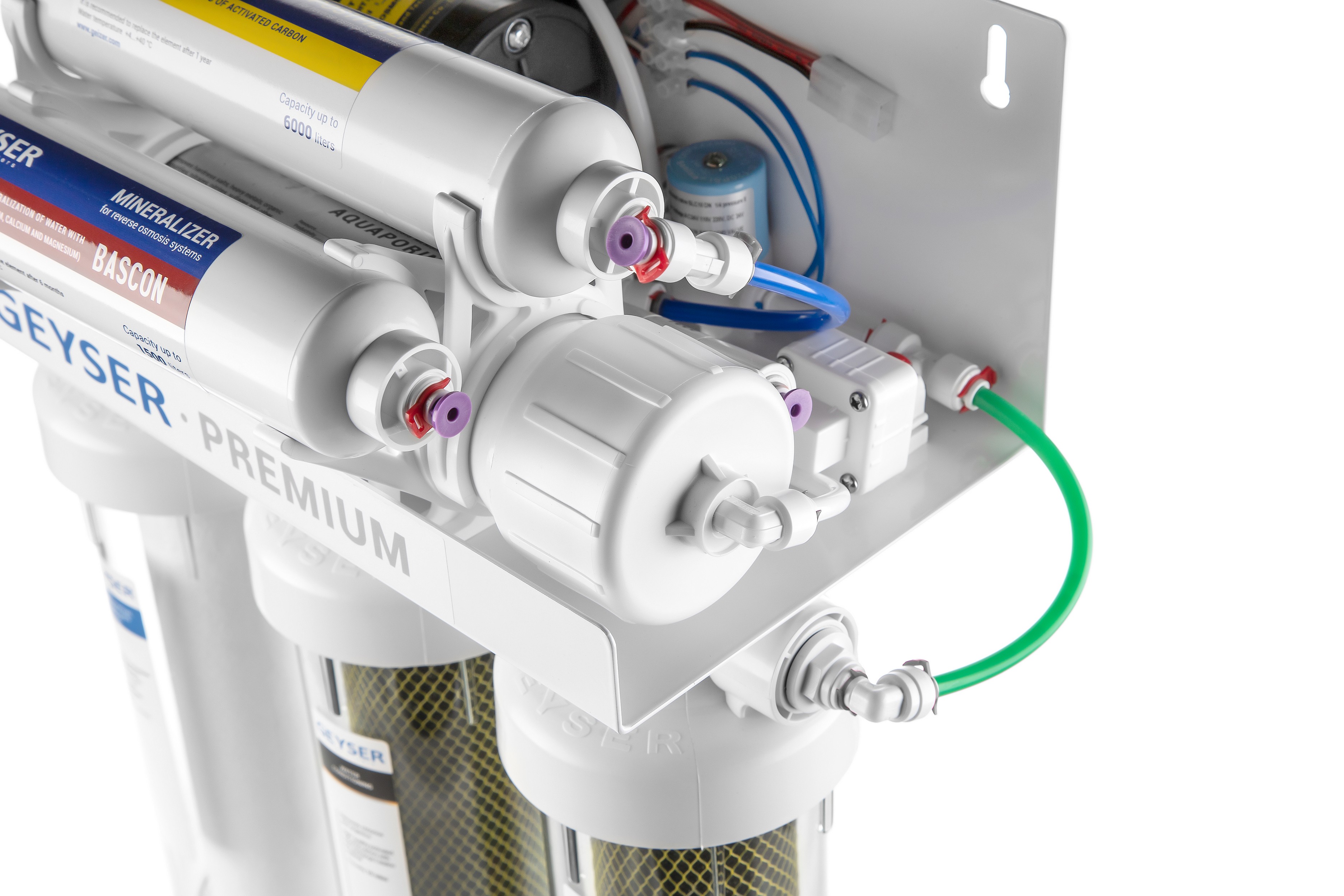 Система обратного осмоса Гейзер Премиум используется для доочистки водопроводной воды от вредных примесей, таких как железо, бактерии, хлорорганические и органические примеси, хлор, тяжелые металлы, нитраты, механические частицы, избыток солей жесткости, а также для корректировки ее минерального состава, что делает воду абсолютно чистой и безопасной. При очистке методом обратного осмоса вода под давлением проходит через полупроницаемую мембрану, задерживающую большинство неорганических соединений и примесей, бактерий и вирусов. Эффективная система предварительной очистки продлевает срок службы мембраны, а благодаря минерализатору вода приобретает оптимальный минеральный состав, что делает ее полезной и безопасной. В набор входит минерализатор Баскон для насыщения очищенной воды полезными солями кальция и магния до оптимального уровня жесткости воды — 1–1,5 мг–экв/л. Особый двухклавишный кран позволяет выбрать минерализованную или осмотическую воду(если вы хотите выпить стакан воды, обогащенной полезными микроэлементами) или без них (для приготовления чая, кофе). Вкус напитков, приготовленных на абсолютно чистой воде гораздо богаче и ароматнее. Корпуса системы выполнены из высокопрочного термопластика ПЭТ. Этот материал устойчив к многократным деформациям при изгибах и растяжении, обладает высокой механической прочностью и низким коэффициентом трения. Все сменные элементы и комплектующие безопасны для контакта с пищевыми продуктами. Фильтр Гейзер Премиум П работает при давлении в подводящей магистрали не менее 1 атм. Устройство повышения давления повысит уровень давления до необходимого рабочего. В набор входит все необходимое для использования сразу после установки. Преимущества: - Безопасность. Эффективное удаление солей жесткости, вредных примесей, бактерий и вирусов.