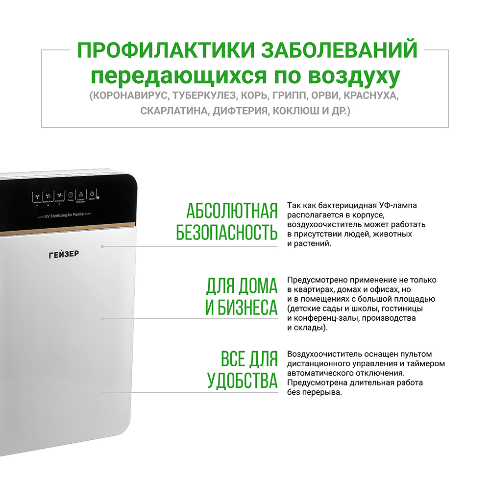 Ультрафиолетовая установка для очистки воздуха Гейзер-1 предназначена для уничтожения бактерий и вирусов в воздухе с эффективностью до 99%. УФ-очиститель воздуха очень эффективен для профилактики гриппа, COVID-19 и других инфекций, передающихся по воздуху.