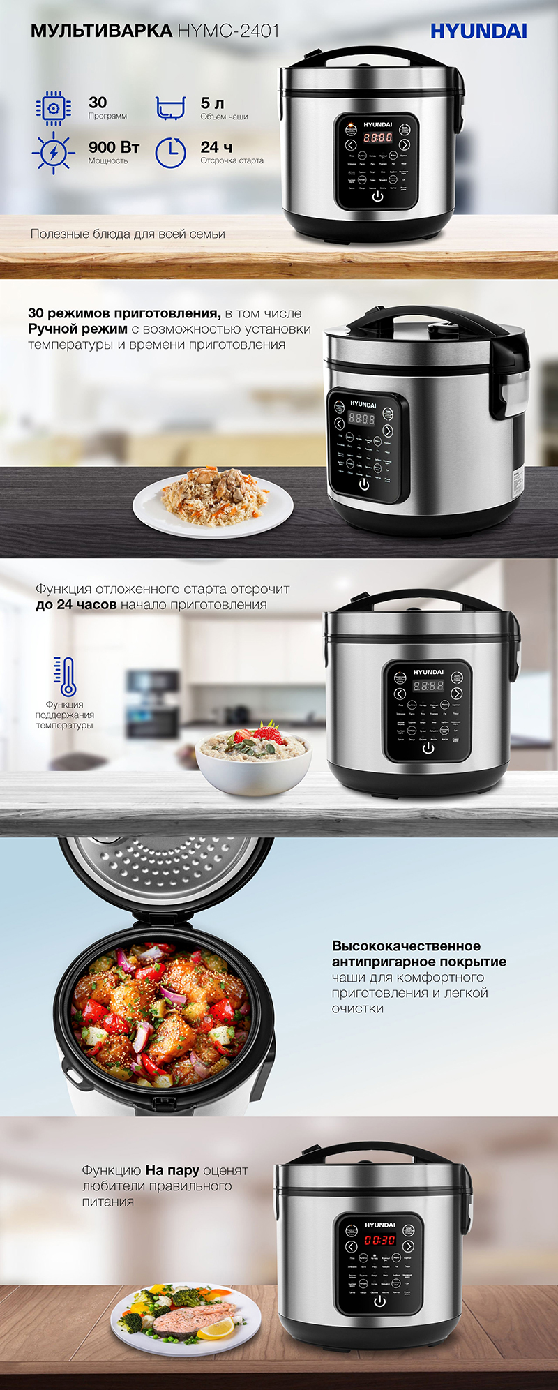 С мультиваркой Hyundai HYMC-2401 готовка даже для большой семьи превращается в простой и приятный процесс, наполненный творчеством.