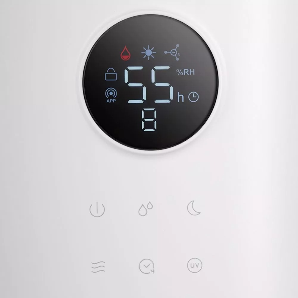 Таймер до 12 часов На дисплее отображаются текущая влажность в помещении, время таймера и заданная влажность при установке таймера и автоматического режима. Кнопка «УФ-лампа» используется для обеззараживания воды в основании увлажнителя.