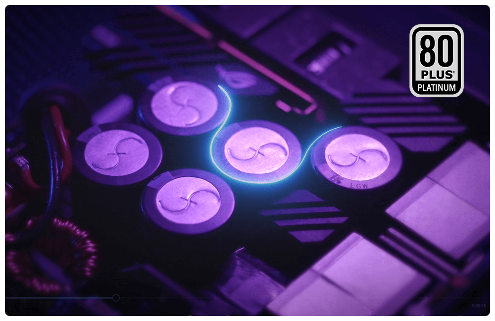 | По высшему разряду Используя высококачественные японские конденсаторы, блок питания ROG Thor 1200W Platinum II может похвастать превосходной энергоэффективностью. Его КПД составляет 89% и 92% под нагрузкой 100% и 50%, соответственно. Повышенная эффективность означает меньший нагрев, следствием чего является пониженный уровень шума от вентилятора и увеличенная надежность работы. |
