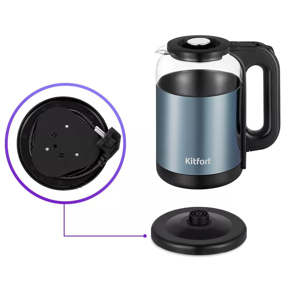 Ничего лишнего! Подставка с центральным контактом дает возможность располагать на ней чайник в любом положении, обеспечивая вращение на 360°. Снизу имеется отсек для хранения шнура, в который можно смотать излишки шнура электропитания.