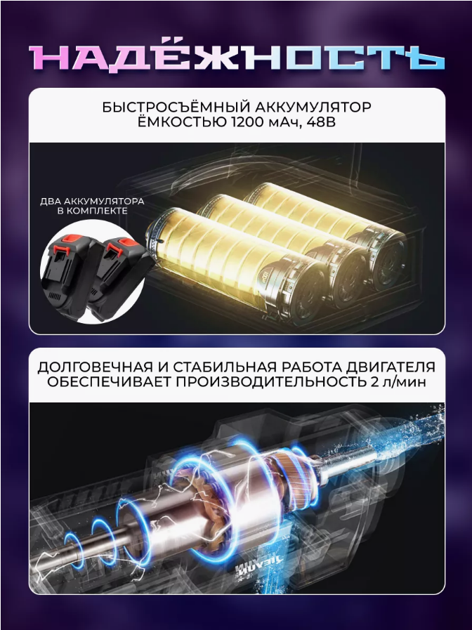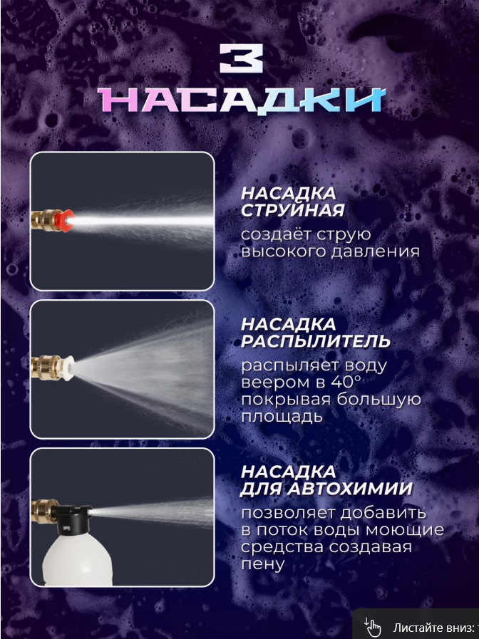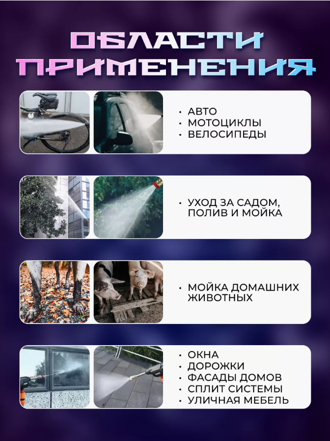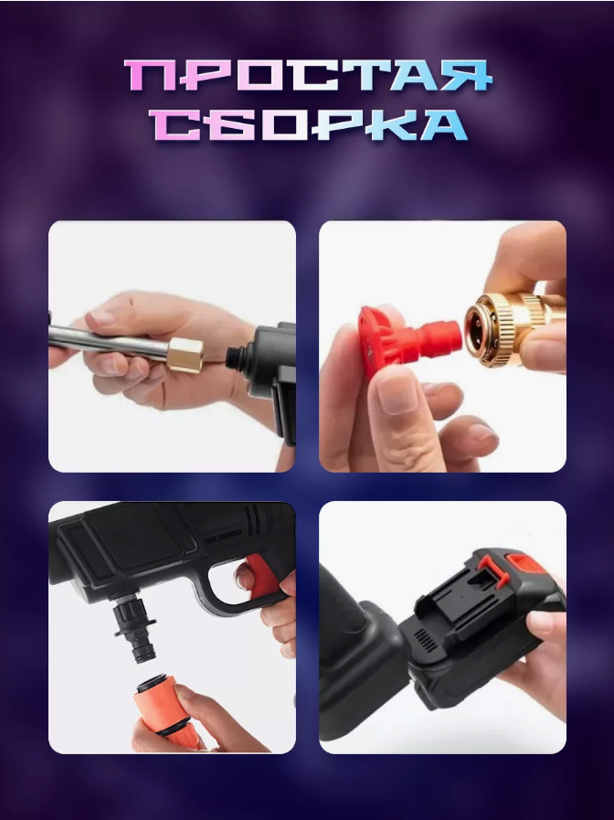Мощная и универсальная: • Не ограничивайтесь только мойкой автомобиля: используйте пистолет для очистки дорожек в саду, фасада дома, террасы, садовой мебели и многого другого. • Эффективность: мощная струя воды легко справится с любыми загрязнениями. • Практичность: компактная и удобная в использовании, не требует много места для хранения. • Надежность: долгий срок службы благодаря защите от перегрева. Аксессуары: • Ёмкость для чистящего средства: добавляйте моющие средства для более эффективной уборки. • Меняйте угол распыления воды (0° и 40°) для разных задач. Так, при помощи настройки на 0 градусов можно с легкостью удалить даже самые стойкие загрязнения, в то время как настройка на 40 градусов обеспечивает равномерное распределение воды, идеально подходящее для мойки больших поверхностей. • Шланг 5 метров: обеспечивает удобную работу на большом расстоянии. • Фильтр для воды: защищает насос от грязи и продлевает срок службы мойки. • Кейс для хранения: обеспечивает удобную транспортировку и хранение всех аксессуаров. Преимущества аккумуляторной мойки: • Мобильность: работайте без привязки к розетке, где бы вы ни находились. • Легкость: компактная и легкая конструкция для комфортной работы. • Безопасность: отсутствие электропитания в непосредственной близости от воды. • Экологичность: не загрязняет окружающую среду. • Экономичность: низкий уровень шума по сравнению с бензиновыми аналогами. |