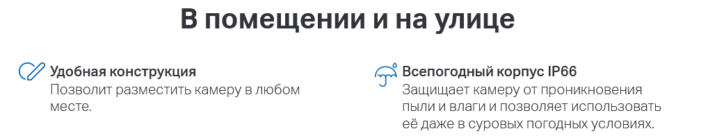 Всепогодный корпус Степень пыле- и влагозащиты корпуса IP66 позволит использовать камеру даже в самых суровых погодных условиях. |