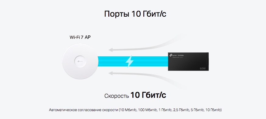 Порт RJ45 для передачи данных и подачи питания до 90 Вт (10 Мбит/с, 100 Мбит/с, 1 Гбит/с, 2,5 Гбит/с, 5 Гбит/с, 10 Гбит/с)