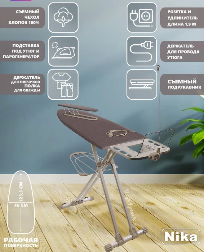 Под доской предусмотрена металлическая полка для белья. На нее можно складывать уже выглаженную одежду. Конструкция дополнена розеткой с держателем для провода и электросоединителем длиной 1.9 м. Это позволяет расположить доску в любое удобное место комнаты, а не вплотную к стене. Пластиковые наконечники на ножках предотвращают скольжение и препятствуют образованию царапин на полу. Также имеются колеса на опорах для удобного перемещения в сложенном виде.