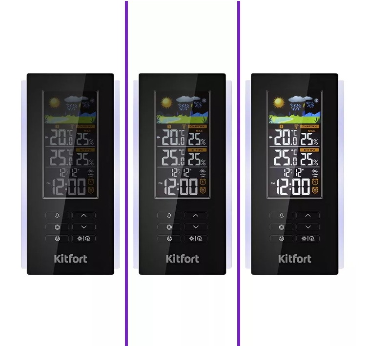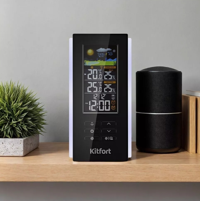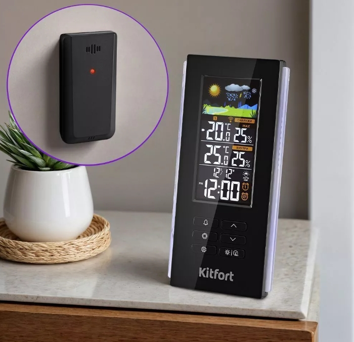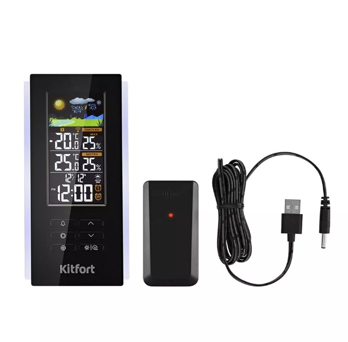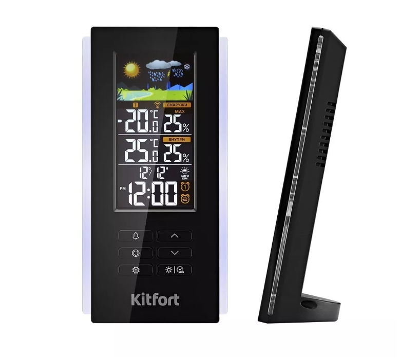 Показывает температуру, погоду и влажность в помещении и на улице Метеостанция КТ-3378 – это прибор, который позволит следить за показаниями температуры и влажности в помещении и на улице, а также погодой. Устройство прогнозирует погодные условия на ближайшие 12–24 часа на основе изменений атмосферного давления.