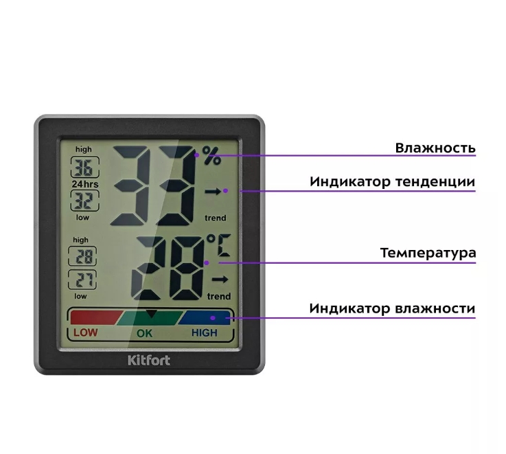 Следите за температурой и влажностью дома! Комнатный термогигрометр показывает текущие температуру и влажность в помещении, а также их максимальные и минимальные значения за сутки. На дисплее помимо температуры отображается индикатор влажности.