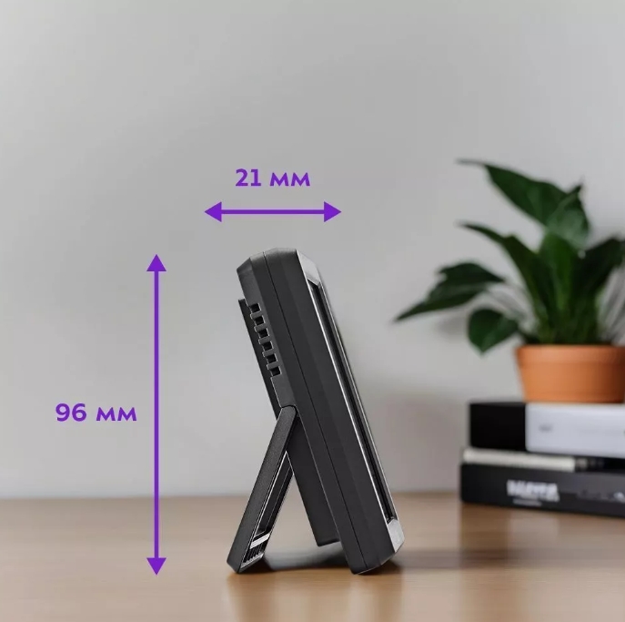 Настольное и настенное размещение На задней части устройства расположены отверстие для настенного крепления и складная ножка, поэтому прибор можно подвесить на стену или поставить на стол.