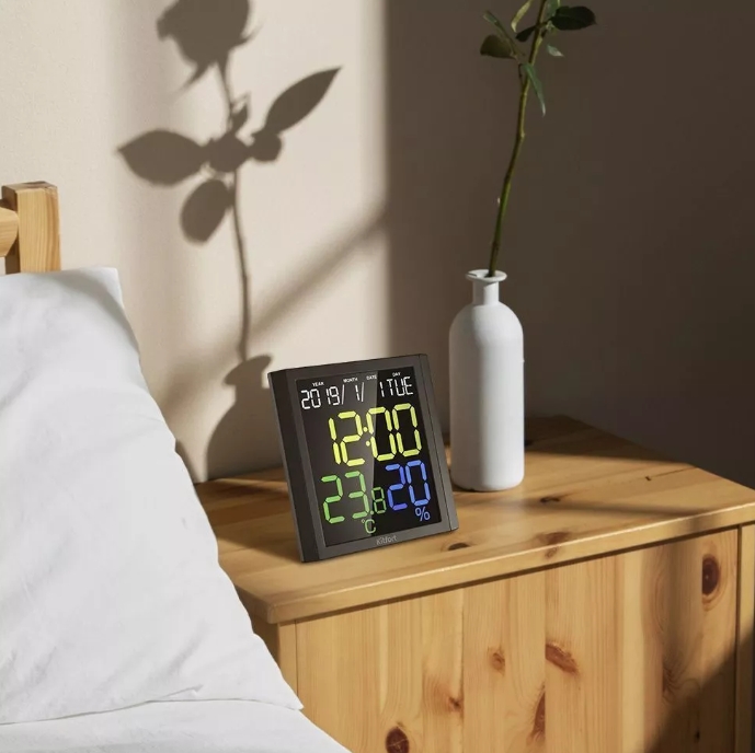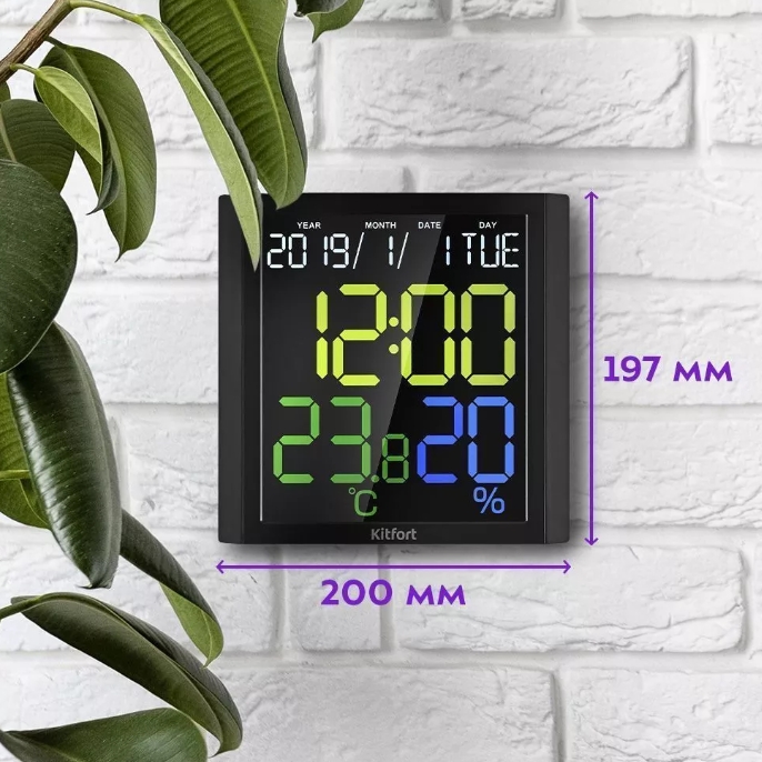 Все важные данные! На задней части устройства расположены отверстия для настенного крепления. Спереди на дисплее отображается время, влажность и температуру в помещении. На верхней части подробно отображена дата.