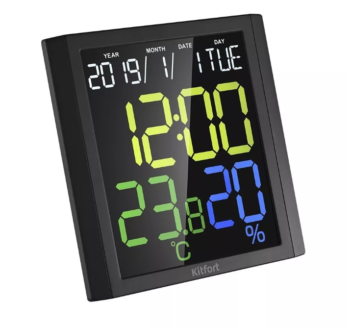 Будь в моменте! Часы с термометром и гигрометром КТ-ЗЗ89 выполняют сразу несколько функций: показывают время, дату, день недели, температуру и уровень влажности в помещении. Температура отображается в градусах Цельсия.