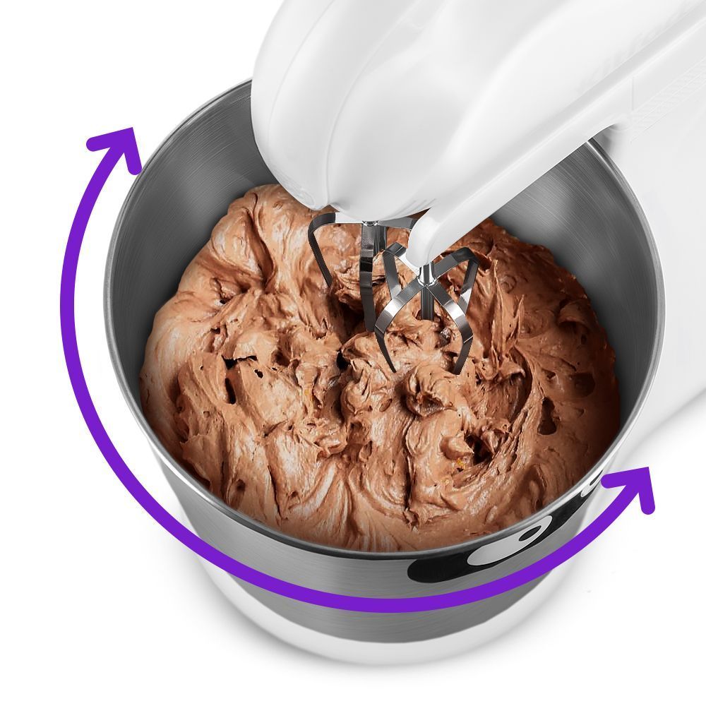 Вращайте чашу самостоятельно Во время работы насадки вращаются вокруг своей оси, а чашу можно вращать вручную. Миксер может работать и в полностью автоматическом режиме без вращения чаши. Вам достаточно только установить насадки, положить ингредиенты в чашу и включить прибор. | ![]() | |