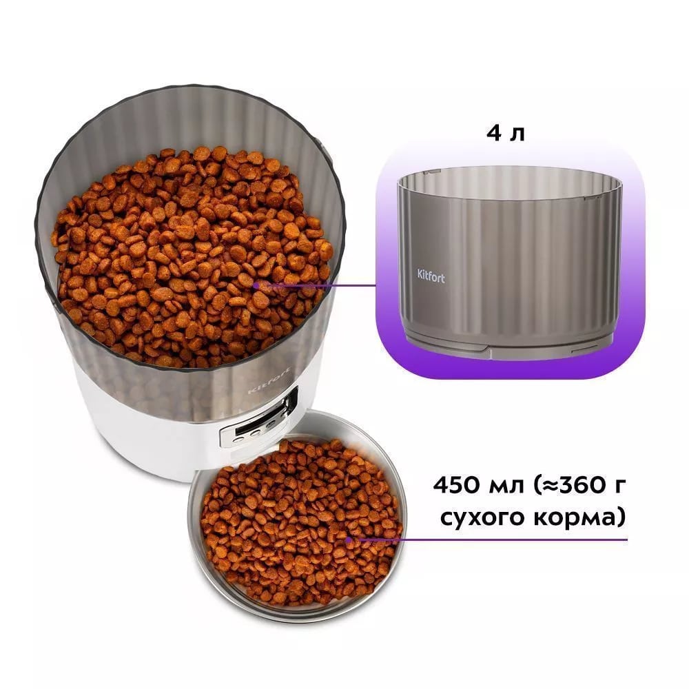 Резервуар для корма ёмкостью 4 л обеспечит питомца кормом на 2–3 недели в зависимости от количества порций. Примерный объём одной порции составляет 5 г. Миска из нержавеющей стали рассчитана на 450 мл (около 360 г сухого корма).