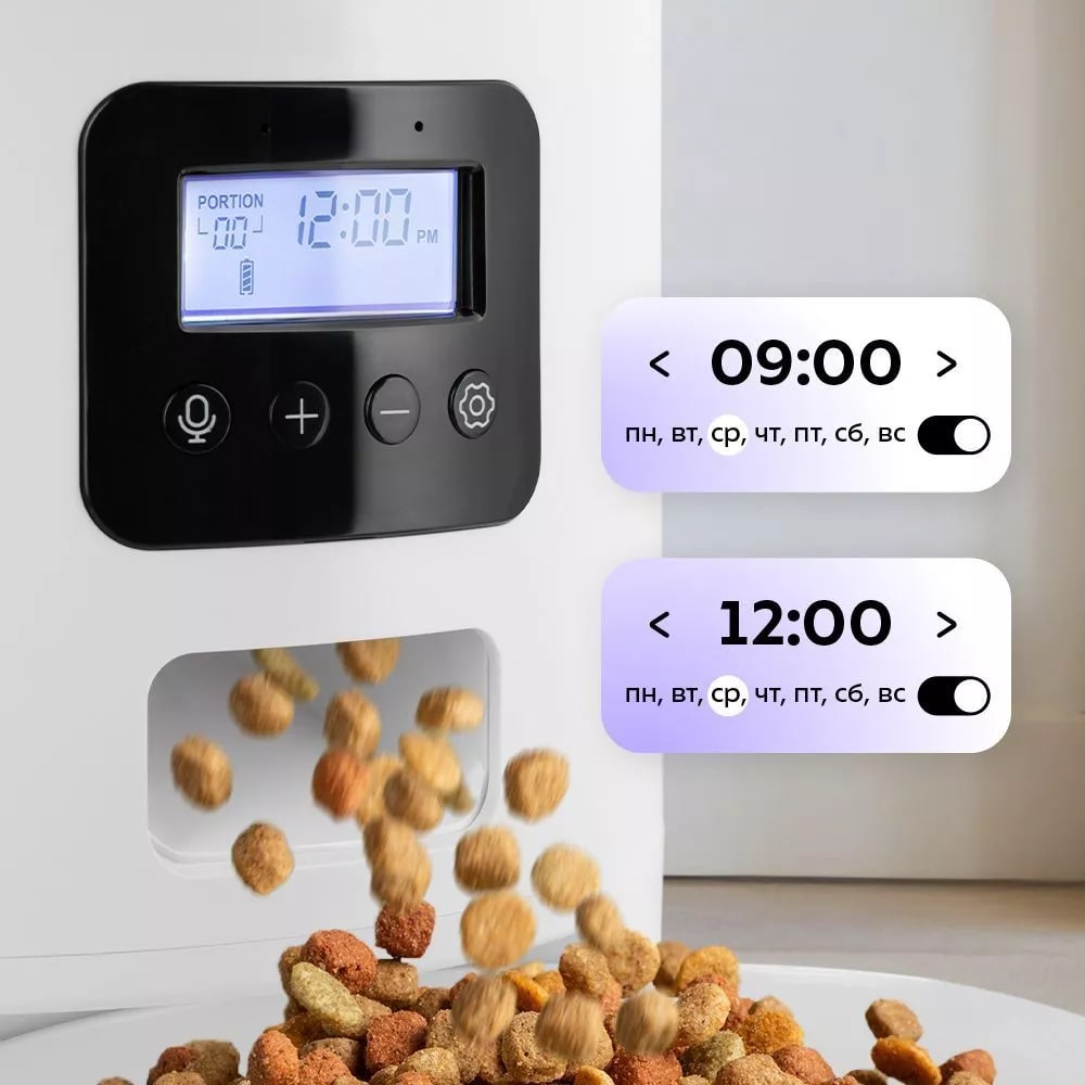 С помощью умной кормушки вы можете настроить до 6 приёмов пищи в сутки, а также отрегулировать объём порций в каждом кормлении. Работа кормушки настраивается с помощью кнопок на панели управления.