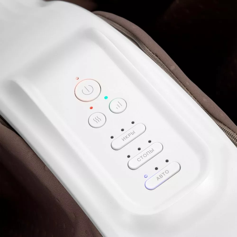 | Удобное управление Кнопка «Икры» циклически переключает режимы массажёра для этой зоны ног. Кнопка «Интенсивность» циклически переключает 3 интенсивности массажа, что соответствует зелёному, синему и красному цвету индикатора. Также вы можете включить нагрев в зоне ступней. |