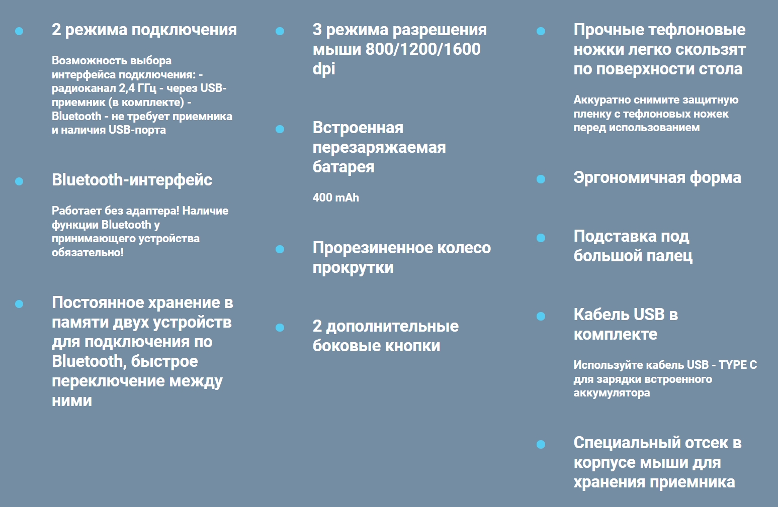 Стильная офисная мышка с возможностью подключения к устройствам по Bluetooth или по радио-каналу 2.4ГГц (через USB-адаптер). Мышка имеет встроенный аккумулятор на 400 мАч, 2 дополнительные боковые кнопки, 3 режима разрешения и тефлоновые ножки для легкого скольжения по поверхности стола.
