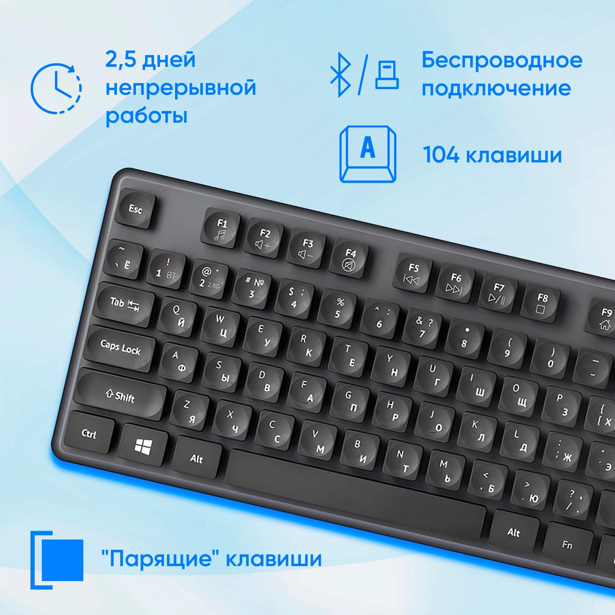 • Особенности клавиатуры: ресурс нажатий до 10 000 000, «парящие клавиши», беспроводное подключение 2,4 ГГц и Bluetooth