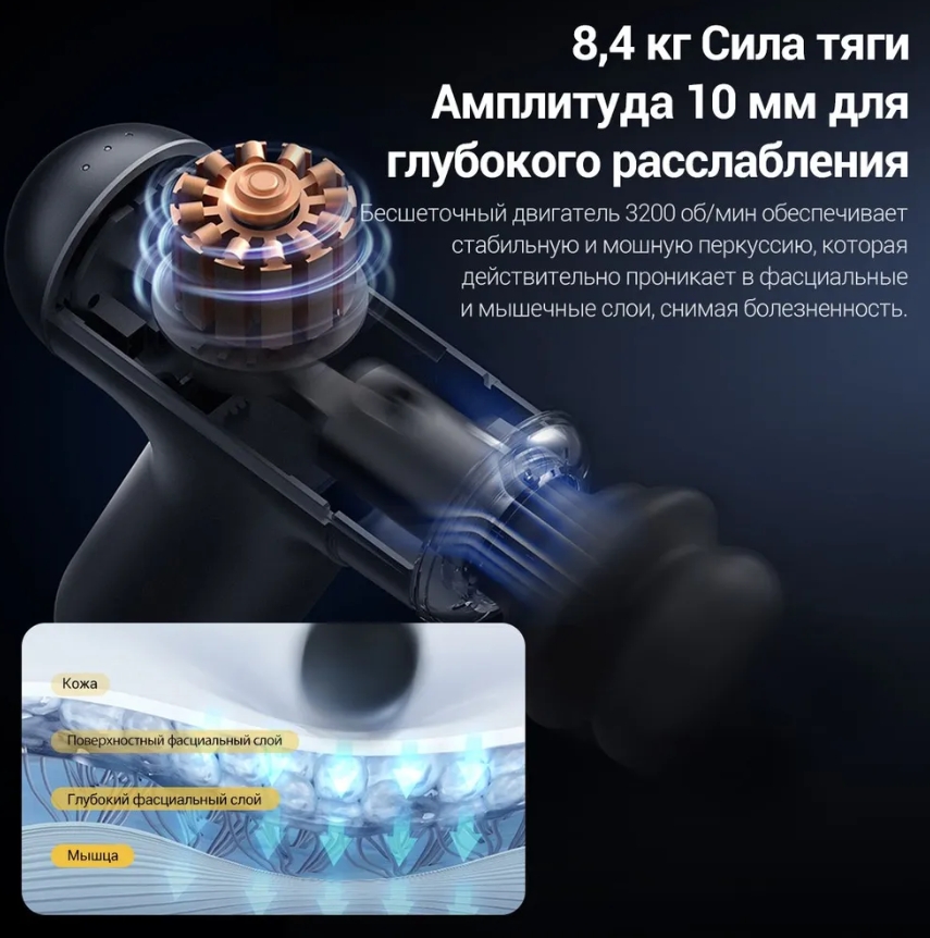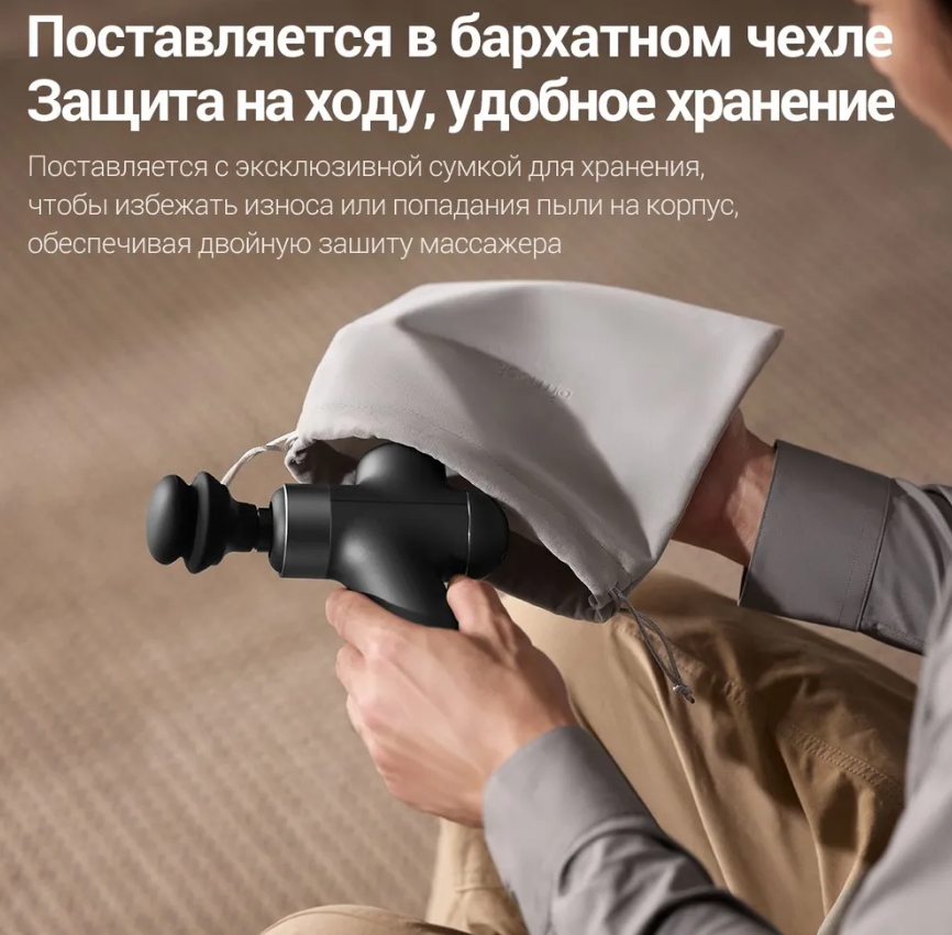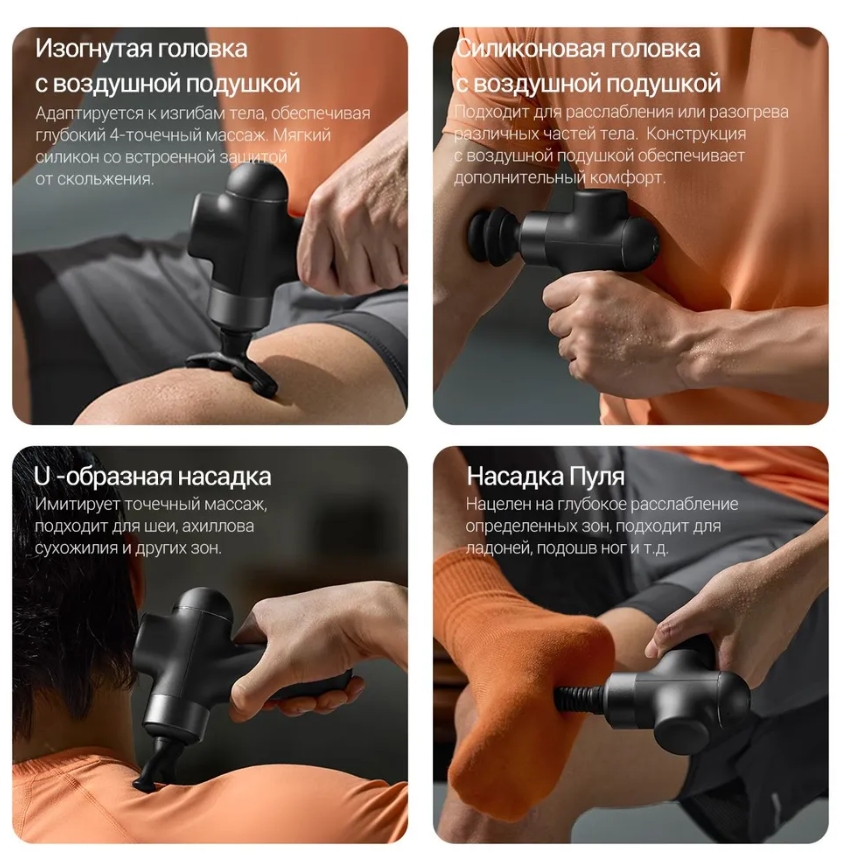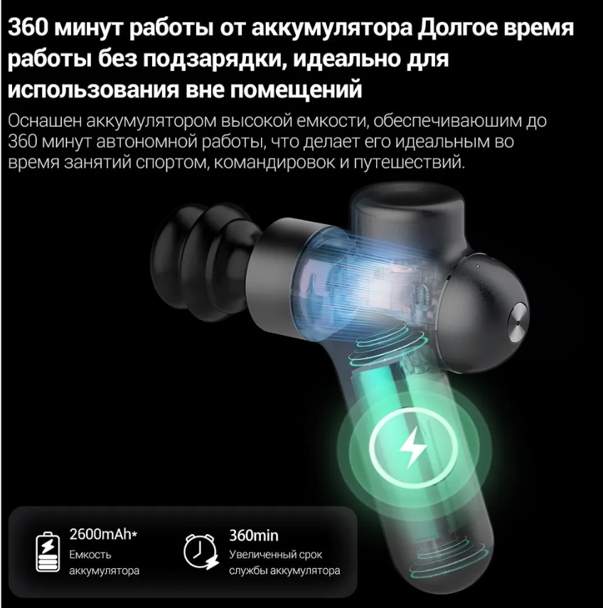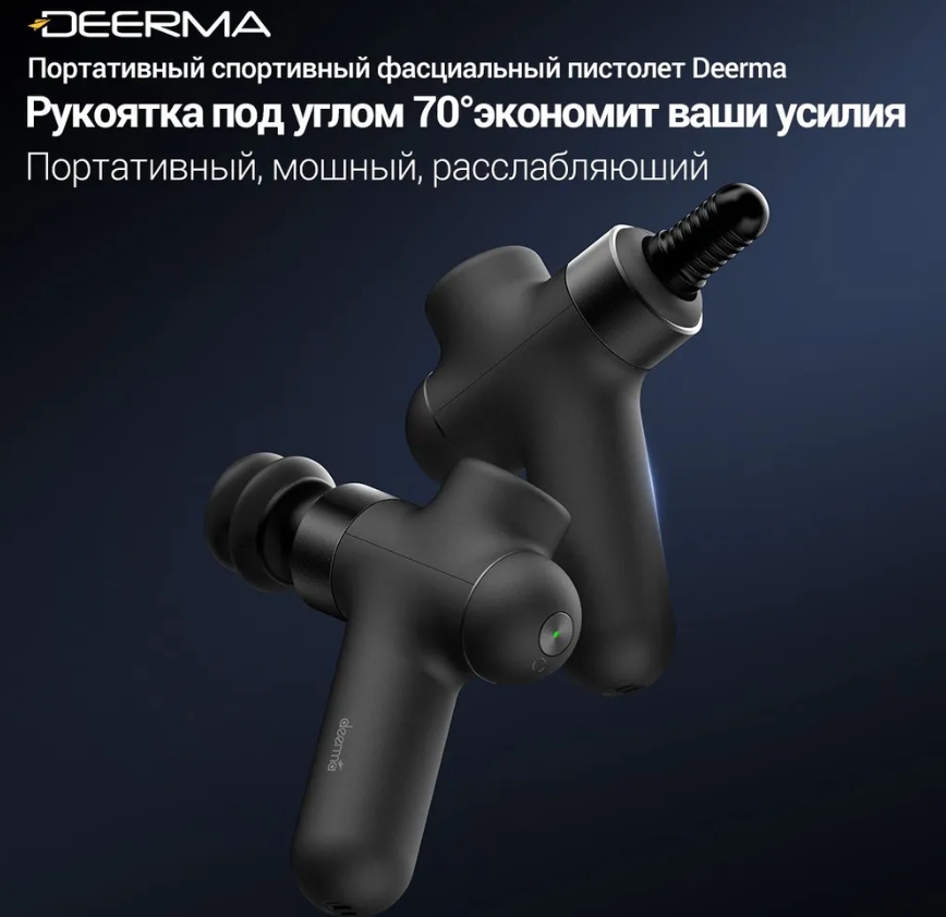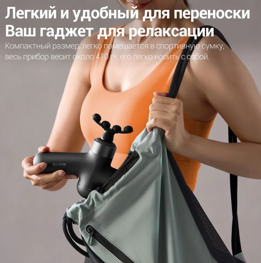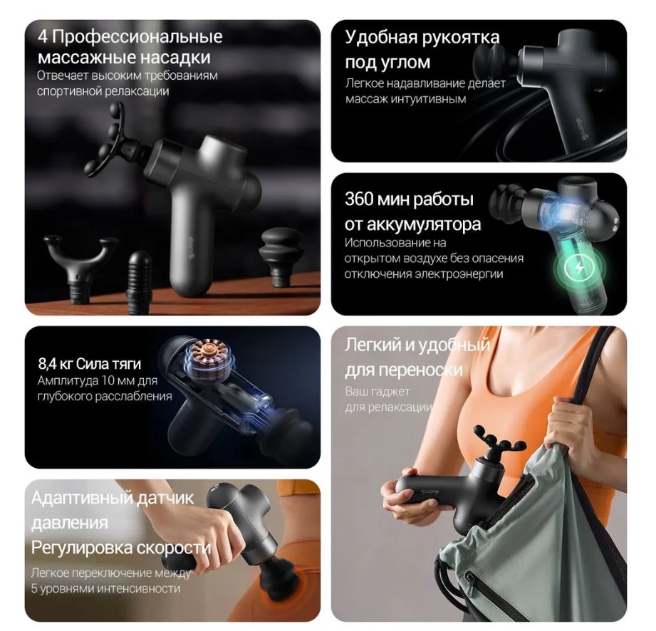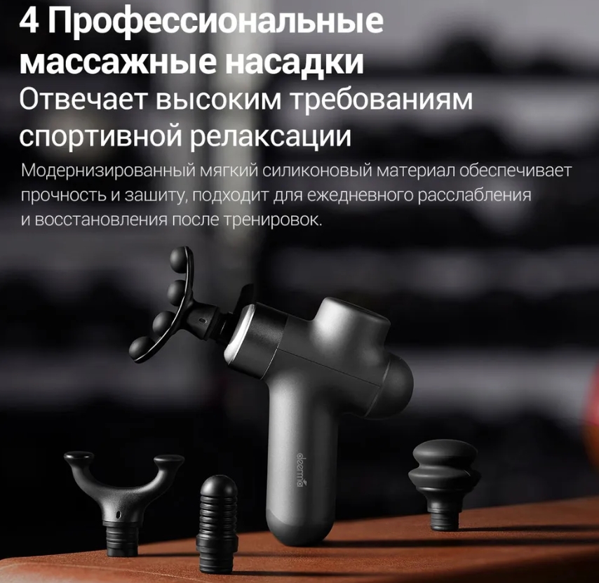 Массажер Deerma DEM-M105G подходит для разных участков тела. Устройство идет в комплекте с четырьмя насадками для работы в разных режимах. Аккумуляторная модель с таймером на 10 минут выдерживает более 4 часов без подзарядки.