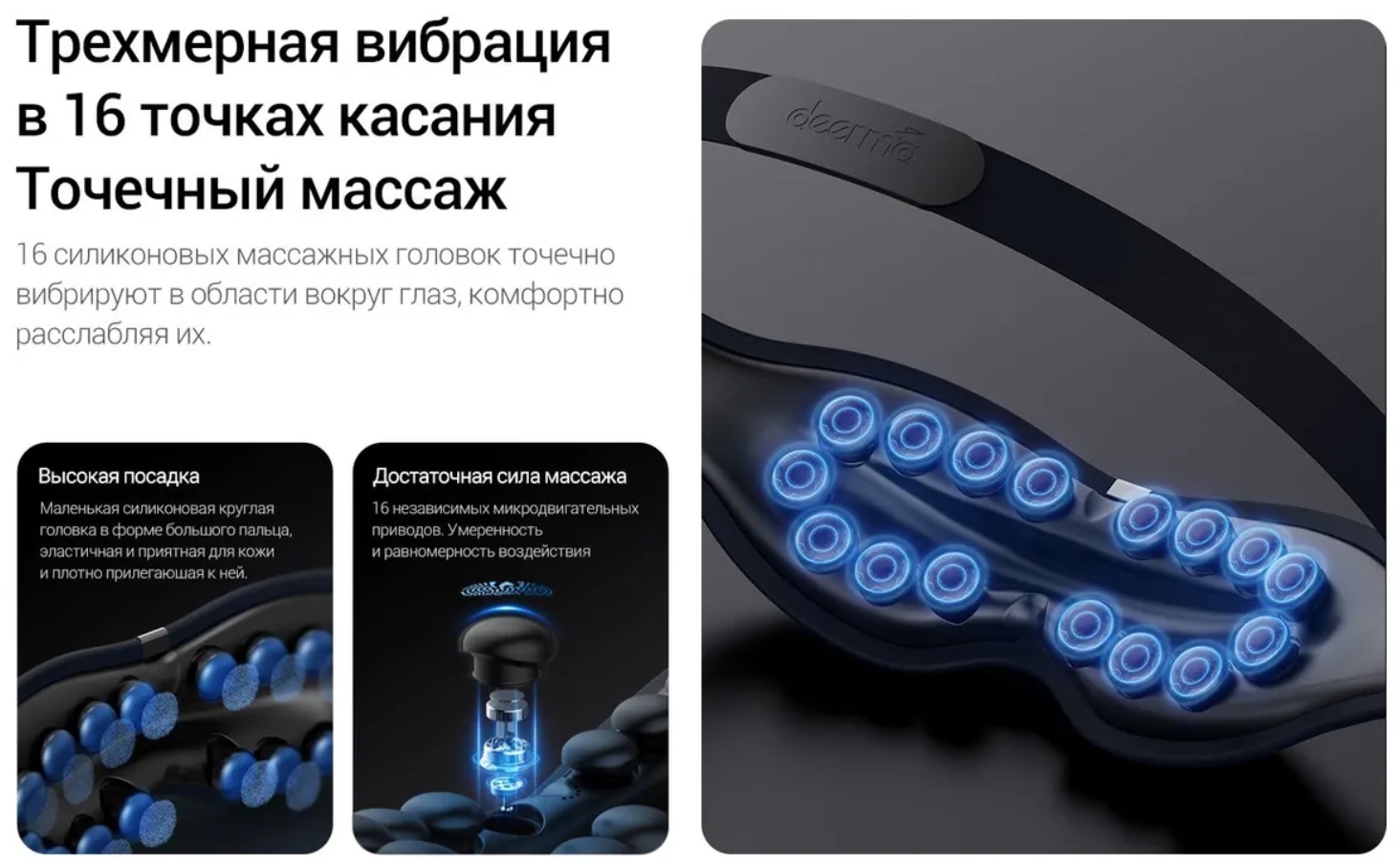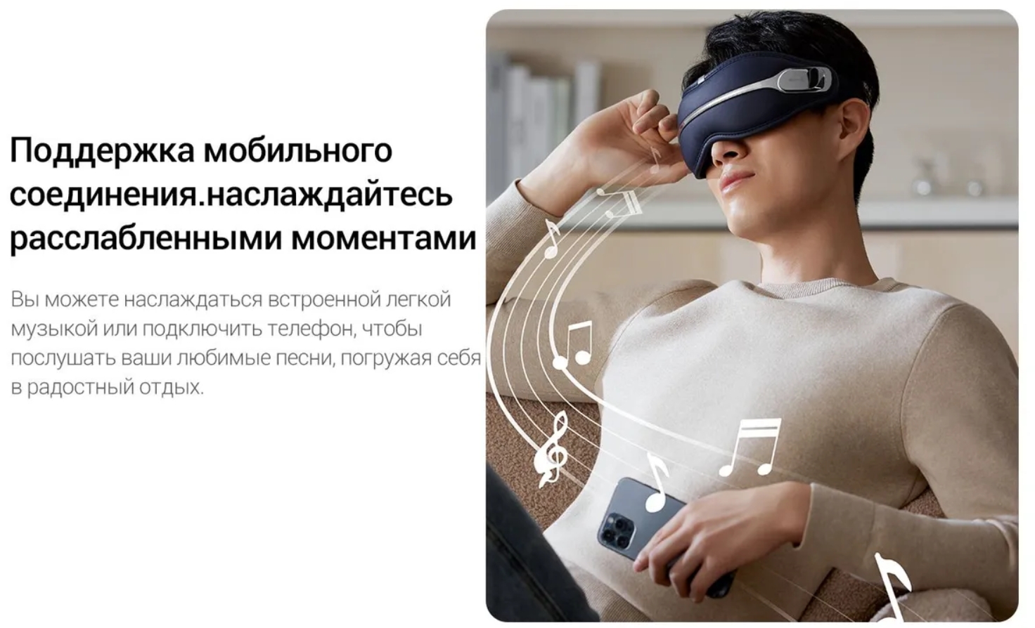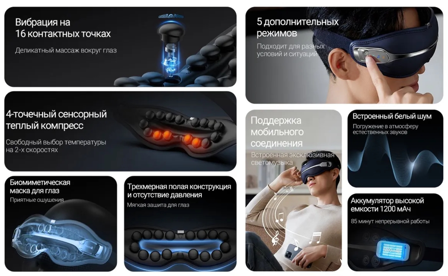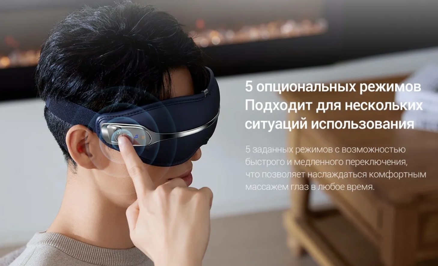Массажер Deerma DEM-M301E для глаз оснащен пятью режимами работы. Устройство дополнено таймером на 15 минут с автоотключением. Есть функции горячего компресса, голосовых подсказок и воспроизведения музыки по Bluetooth. Заряда аккумулятора хватает на 1.5 ч работы.