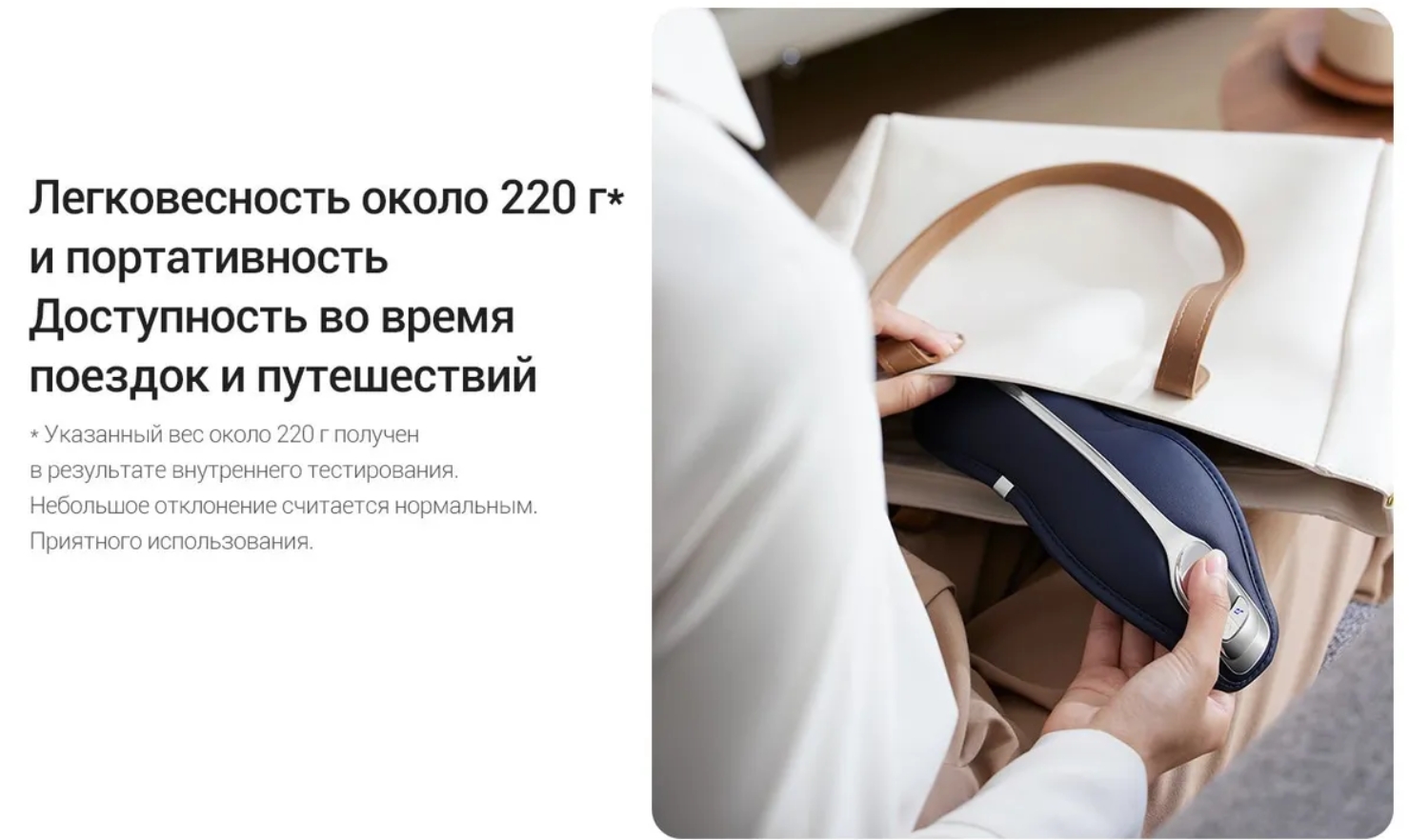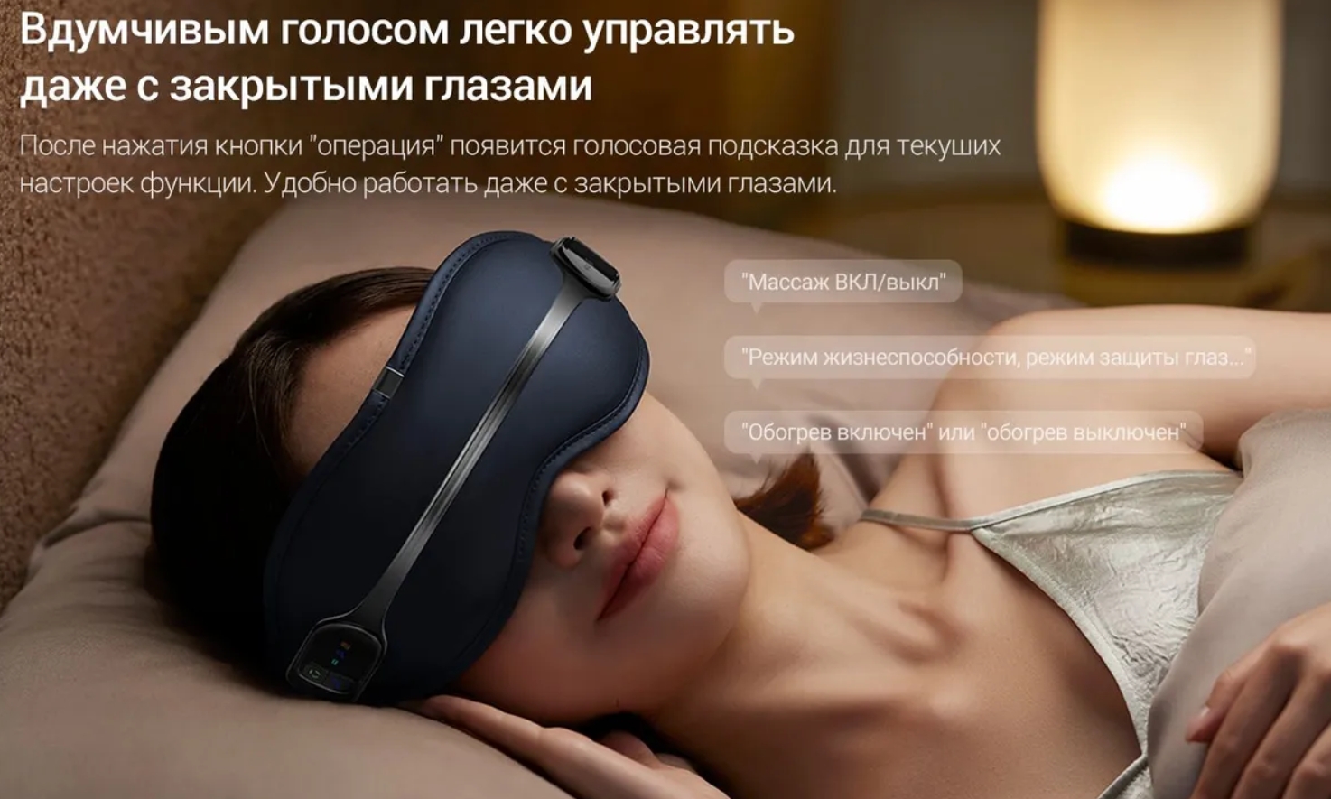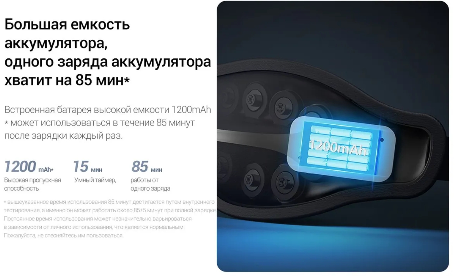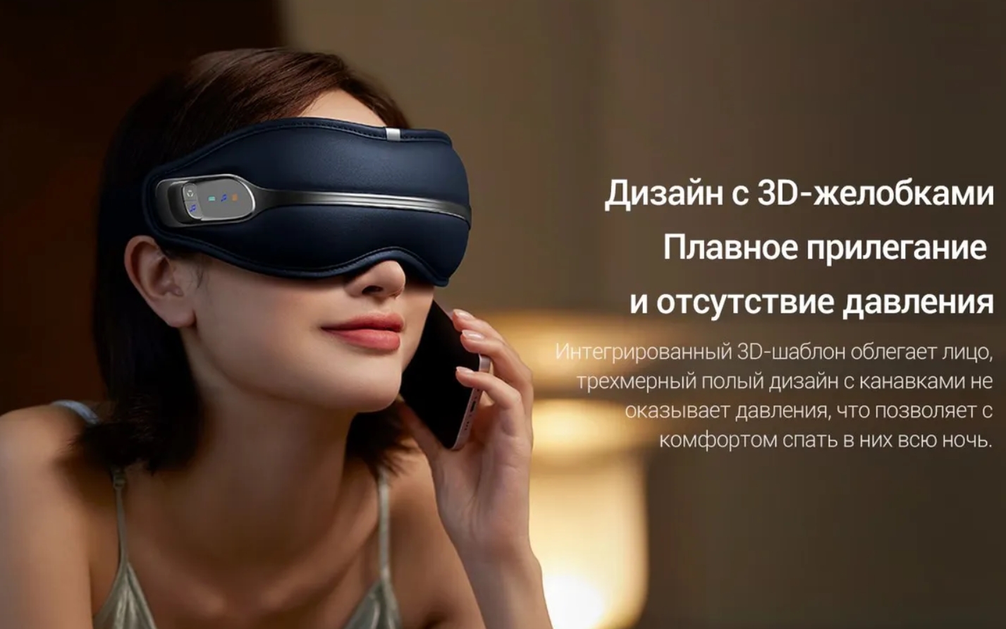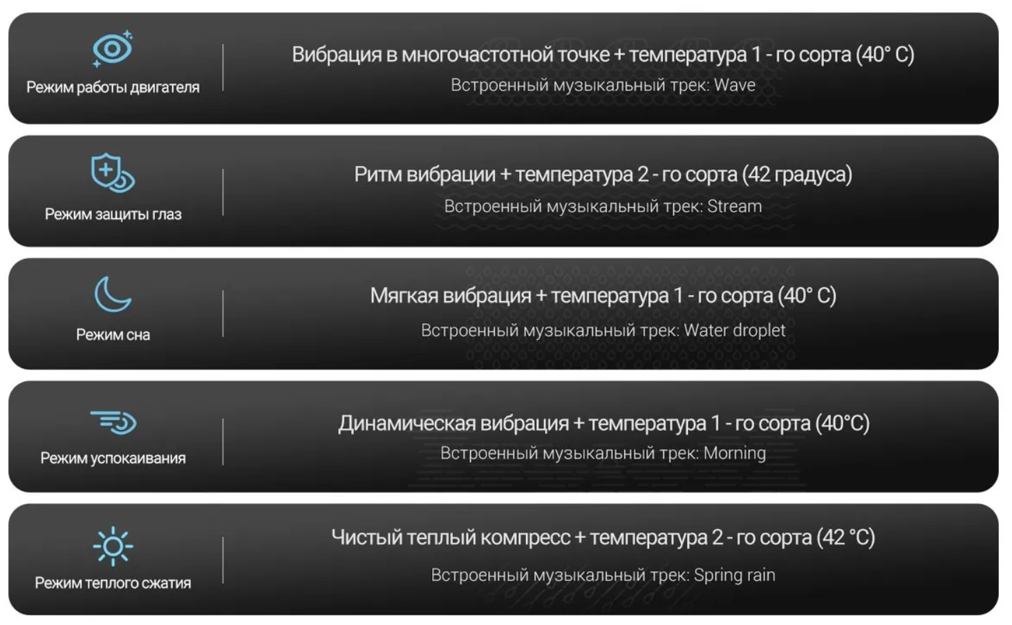 Массажер Deerma DEM-M301E для глаз оснащен пятью режимами работы. Устройство дополнено таймером на 15 минут с автоотключением. Есть функции горячего компресса, голосовых подсказок и воспроизведения музыки по Bluetooth. Заряда аккумулятора хватает на 1.5 ч работы.
