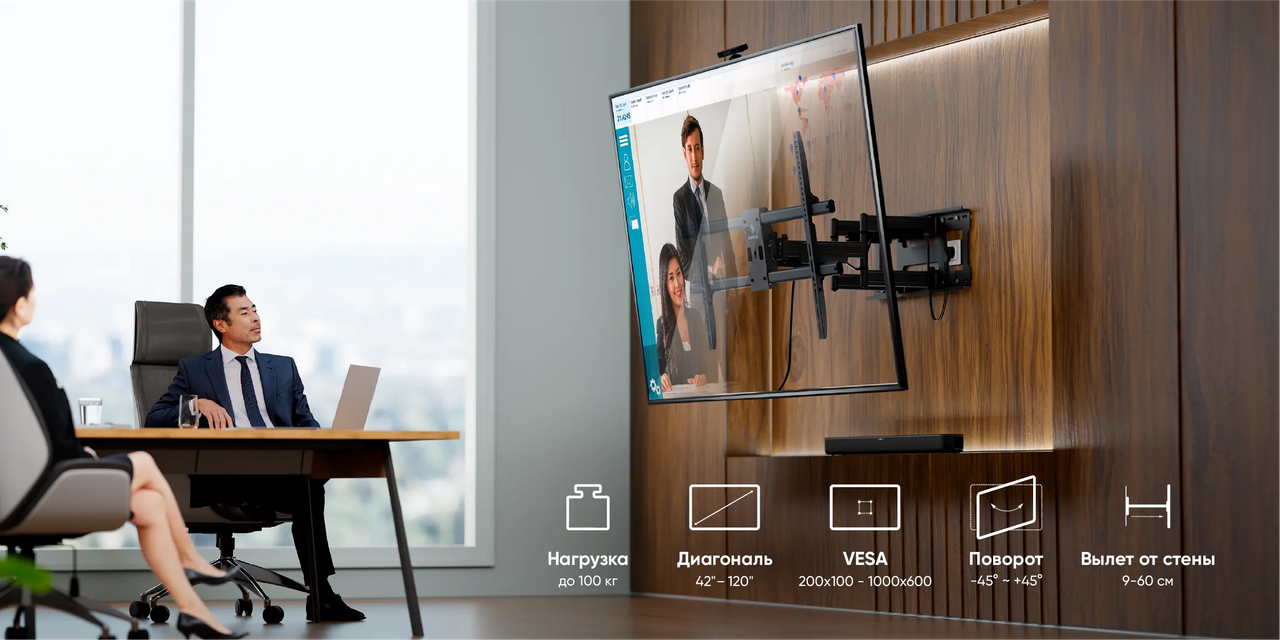 | ONKRON M10 - компактный и мощный кронштейн для офисов, магазинов и других сфер бизнеса, где используются большие экраны до 100 кг весом. Идеально подходит для установки интерактивной панели или ТВ в нишу. Даже самый большой экран на кронштейне вы сможете настроить без лишних усилий. Минимальное расстояние от стены составляет всего 9 см, а максимальное – 60 см. |