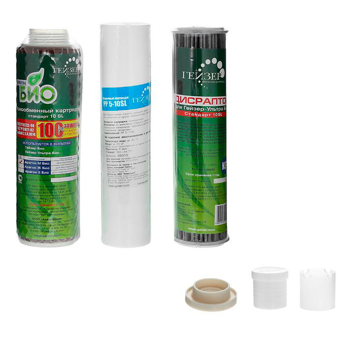 | Комплект картриджей «Гейзер № 14» предназначен для замены исчерпавших свой ресурс картриджей в стационарных трехступенчатых фильтрах Гейзер «Ультра Био». Применяется для регионов с мягкой водой. Подобраны картриджи стандарта 10 SL, обеспечивающие комплексную очистку воды с двойной защитой от бактерий, вирусов, их цист. Подобранные модули способствуют минерализации воды, так как специально разработаны для воды с низким содержанием солей кальция и магния. Картридж механической очистки — эти картриджи применяются в бытовых фильтрах для очистки воды от грязи, взвешенных частиц и нерастворимых примесей. Этот недорогой фильтроэлемент первым принимает удар на себя. В условиях возможных грязевых выбросов в водопровод это простой и эффективный способ очистки воды для защиты картриджей тонкой очистки. Вышедший из строя первый картридж быстро и просто заменяется, зато остальные фильтроэлементы в системе очистки воды работают дольше и с максимальной эффективностью. Степень очистки определяется размерами пор в картридже. Картридж Аргон М-Био — содержит особо эффективный бактериодинамический агент, который в сочетании с материалом Арагон и при сохранении в картридже серебра в несмываемой форме, создает тройную гарантию защиты от бактерий и вирусов. Арагон М-Био задерживает самые мелкие механические частицы и удаляет растворенные химические примеси, благодаря сложной внутренней структуре, механизмам сорбции и ионного обмена. Картридж полностью удаляет из воды все бактерии и вирусы, включая Гепатит А, ротавирусы и норо-вирусы, согласно протоколам испытаний 10/12, 11/12 от 10.12.2012 ИПЛ ПЧС МЧС № 164. Серебро, введенное в структуру материала в металлической несмываемой форме, полностью блокирует размножение отфильтрованных бактерий и вирусов. В картридже Арагон М-Био изменяется структура растворенных в воде солей жесткости, образуется полезная для организма человека арагонитовая форма карбоната кальция. В результате повышается усвояемость кальция. Дисраптор — новейшая технология удаления вирусов, бактерий, цист, гуминовых соединений. Уникальный фильтроматериал на основе наноалюминиевых волокон от американской компании Ahlstrom. Эффективно снижает уровень хлора, железа и тяжелых металлов. Протестирован по американским стандартам 42, 53, 61 NSF (Национального Санитарного Фонда). |  |