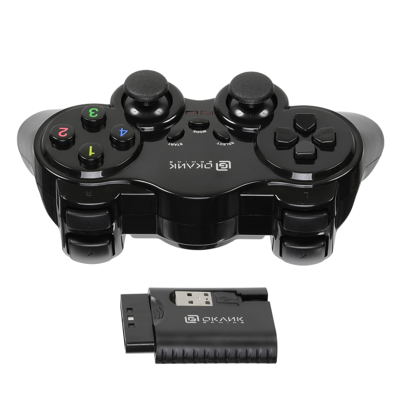 | Геймпад поддерживает сразу несколько платформ – это ПК на базе ОС Windows и игровые консоли Sony PlayStation 1, 2 и 3. Подключение осуществляется без проводов через комплектный радиочастотный ресивер, на котором находятся 2 разъемы: USB и фирменный PlayStation Controller Port. На геймпаде расположено 12 кнопок управления, 4-направленный D-Pad, а также два многоосевых стика. На задней стороне расположены кнопки R1, R2, а также L1 и L2. Геймпад поддерживает виброрежим. Для питания используются три батарейки стандарта ААА. | |