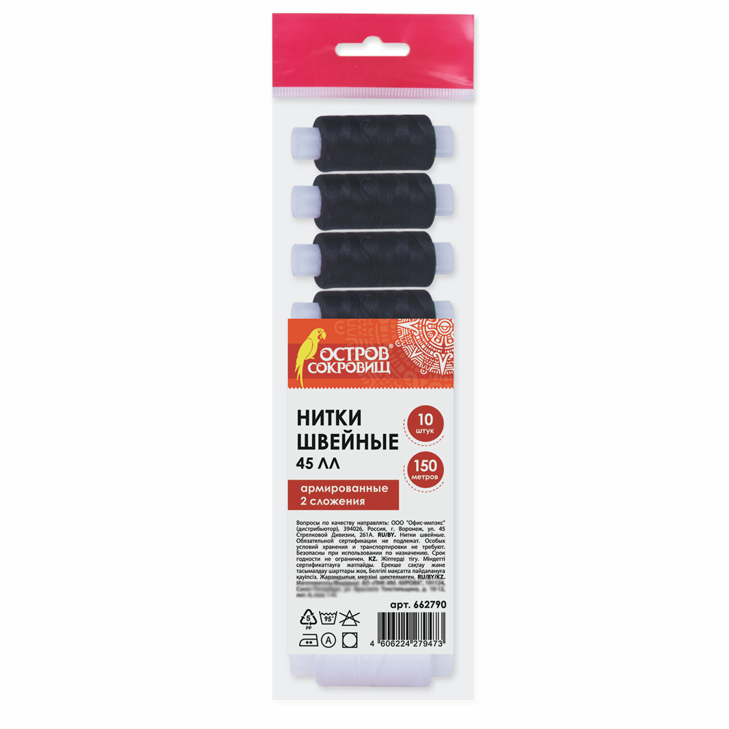 Набор ниток ОСТРОВ СОКРОВИЩ предназначен для сшивания деталей из ткани вручную и использования в бытовых швейных машинах.