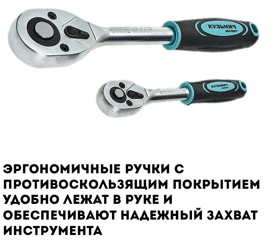 - рукоятка реверсивная (трещотка) 1/2" с функцией быстрого сброса – 250 мм, храповый механизм с 45 зубьями, рабочий угол 8° – 1 штука;