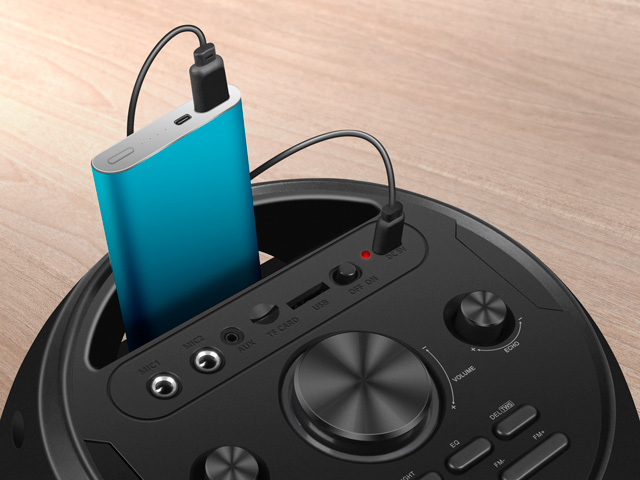 Настройся на долгую вечеринку! Веселье продолжилось немного дольше, чем планировали? Разместив пауэрбанк в специальной нише на корпусе колонки, вы всегда сможете быстро зарядить колонку и продолжить веселье! Пойте и танцуйте вместе с друзьями в любом месте без перерыва! |  |