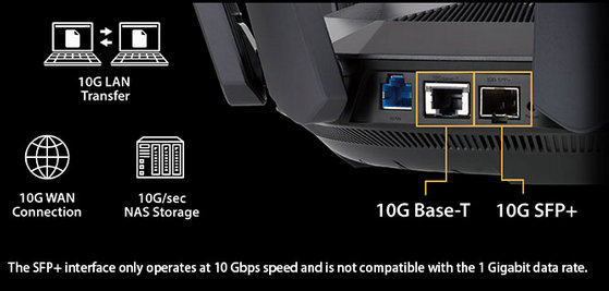 Высокоскоростное проводное подключение RT-AX89X оборудован двумя портами 10 Gigabit Ethernet (один – Base-T, второй – SFP+), таким образом он поддерживает подключение на скорости до 10 Гбит/с как через оптоволоконный, так и через медный кабель. Это позволяет использовать максимально быстрые каналы подключения к ISP, а также реализовать высокоскоростное подключение ПК к NAS в собственной локальной сети стандарта 10G. |  |