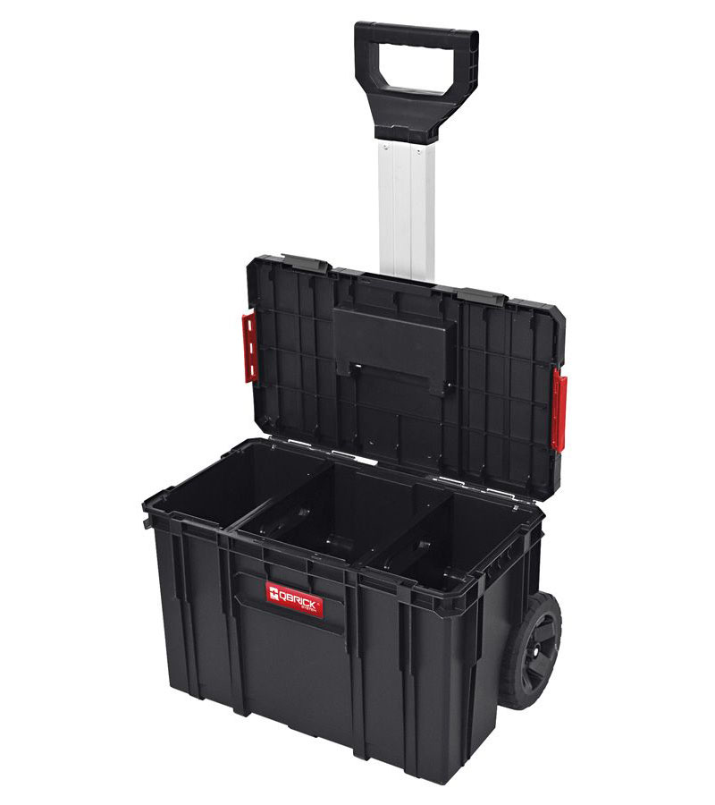 Модульная трёхсекционная мобильная система ящиков Qbrick System TWO , позволяет подобрать вид транспортировки инструментов и аксессуаров для текущих потребностей. Мобильная тележка, ящики для инструментов и органайзеры на мелкие аксессуары - эти 3 секции, соединены простыми в использовании защелками-соединителями Модульный, мобильный ящик для инструментов с легко открывающейся интегрируемой крышкой. Сверхпрочная телескопическая ручка гарантирует долговечность и маневренность.