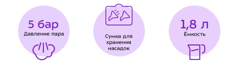 Целый комплект насадок!Скребок для стекла используется для чистки окон, зеркал, кафеля. Струйная насадка подходит для чистки плинтусов, щелей и других углов. Щётки - для удаления стойких загрязнений. Насадкой для отпаривания можно отпаривать одежду, шторы, мягкую мебель.Комфортная уборка половНа напольную щётку устанавливается тряпка с помощью специальных зажимов. Такая конструкция надёжно фиксирует её и не позволяет съезжать с щётки во время уборки.Управление одной рукойКурок подачи пара удобно располагается под пальцами. Для обеспечения безопасности он оснащён блокиратором, чтобы исключить случайную подачу пара.Легко и просто!Пароочиститель простой в управлении. На корпусе есть кнопка включения/выключения, а также индикатор готовности пара.Продумано до мелочей!В комплекте с пароочистителем идёт мерный стакан для удобного добавления воды в бойлер. Ёмкость составляет 1,8 л.Защитные механизмы для безопасной работы пароочистителяДатчик давления поддерживает давление в бойлере в рабочем диапазоне. При достижении max значения нагрев выключается и включается вновь при расходе пара. В случае поломки датчика давления и перегрева прибора сработает термопредохранитель, обесточив прибор.Держатель щётки, На корпусе пароочистителя рядом с крышкой бойлера расположен держатель. Он служит не только для более удобного хранения шнура, но и для того, чтобы можно было поставить на парковку щётку с удлинительной трубкой. | |