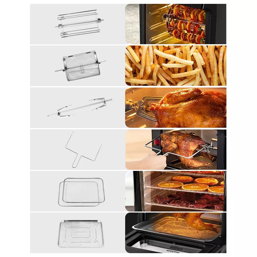 Все необходимое для кулинарных экспериментов уже в комплекте!В комплекте к аэрогрилю идут сетка и сетчатый противень для приготовления или сушки продуктов, вертел с вилками для приготовления курицы-гриль или больших порций мяса, шампуры для шашлыка, вращающаяся корзина и специальный поддон для сбора жидкости. | ![]() |