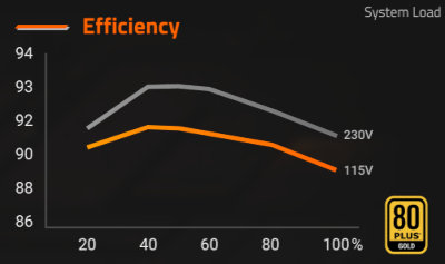 ![]() | Сертификат 80 PLUS GOLDИзделие, отвечающее требованиям сертификата 80 Plus Gold, в условиях 50% нагрузки, демонстрирует энергоэффективность на уровне >90%. Чем выше энергоэффективность тем ниже потери в цепях питания, на фоне комфортного температурного режима для ключевых компонентов и пониженного уровня шума вентилятора системы охлаждения. |