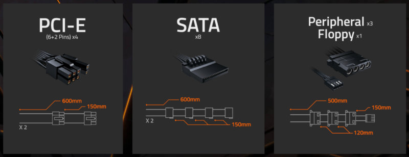 - Кабель с разъемом PCI-e 6+2 контакта x 4: 600мм+150мм*2