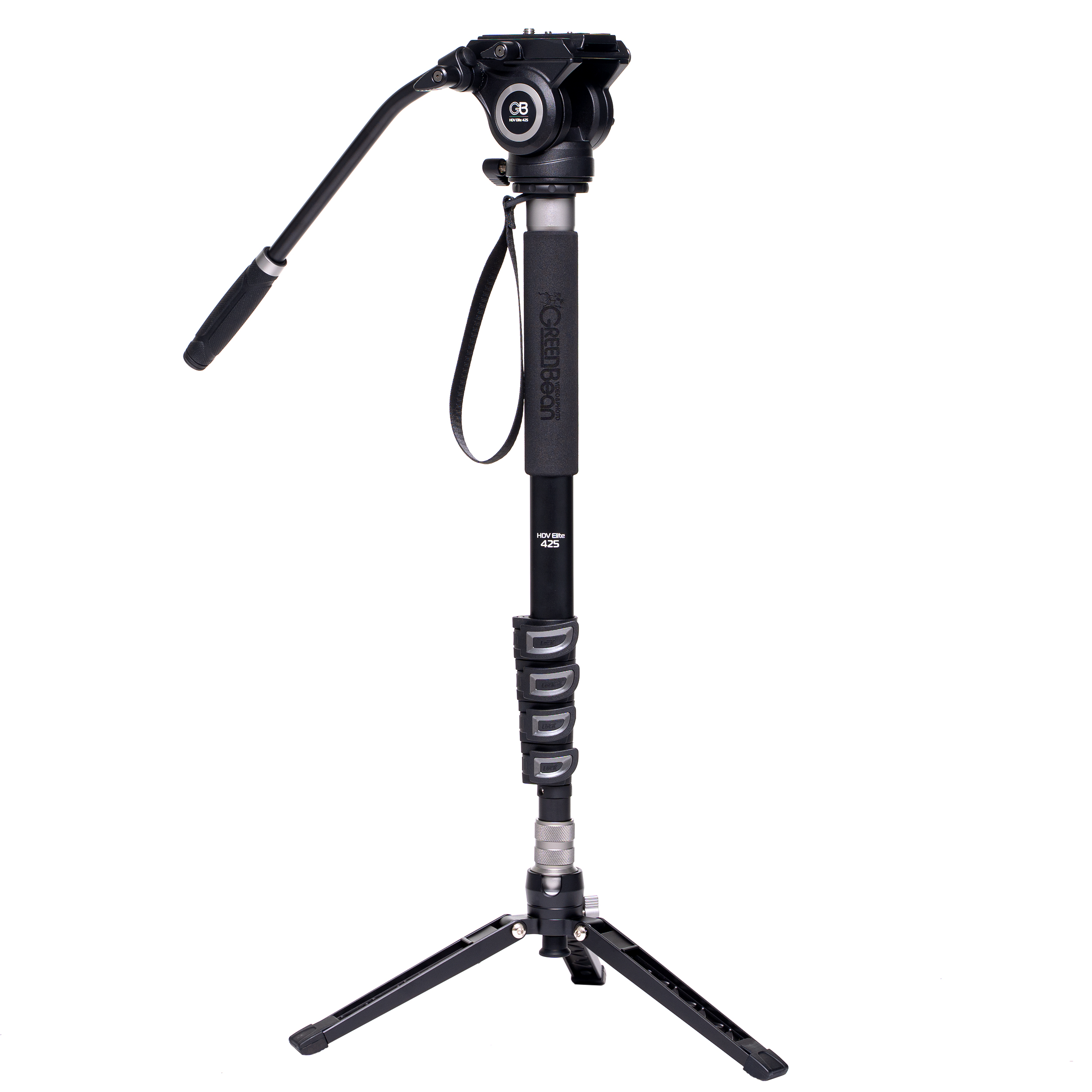 Алюминиевый 5-секционный монопод со съёмной видеоголовкой (с жидкостным демпфированием и контрбалансом) предназначен для съемки камерами весом до 5 кг. Съёмное основание с шаровой головкой имеет фиксируемые углы раствора ножек, его можно использовать отдельно, как настольный штатив для фото/видеосъемки. В сочетании с возможностью плавного панорамирования жидкостной видеоголовки монопод позволяет оператору снимать качественное видео даже в неблагоприятных условиях.