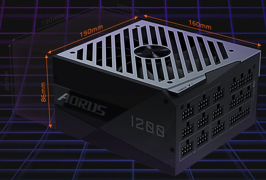 | Компактные габариты Благодаря фирменной технологии рассеивания тепла и оригинальным инженерным разработкам, реализованным в составе различных продуктов, а также применению высококачественной элементной базы, габариты блока питания AORUS мощностью 1200 Вт удалось существенно уменьшить до 160 мм (вместо типовой длины 200 мм), таким образом, изделие GIGABYTE можно без труда установить в любое шасси, даже в условиях ограниченного пространства. |