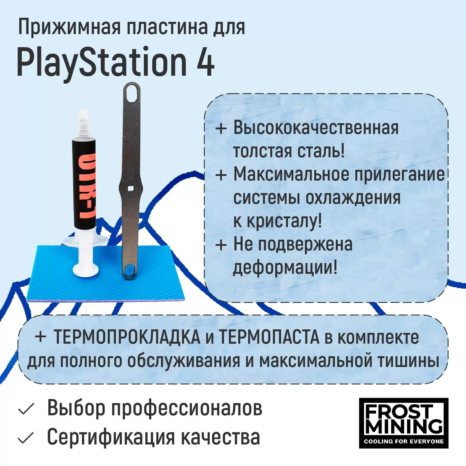 Комплект для обслуживания PS4 от компании Frost Mining для ревизий 10хх-11хх - Прижимная пластина + Термопаста 13 Вт/мК 1гр + Термопрокладка 8 Вт/мК 1мм. Оптимизированный интерфейс для улучшения прижима радиатора к процессору, что устраняет перегрев и шум PS4. Проработанная форма позволяет установить прижимную пластину на родные винты. Используя наш комплект, Вы сможете не только убрать шум, но и охладить Вашу приставку и продлить ее жизнь Важно закручивать винты крест-накрест равномерно, чтобы не повредить процессор.