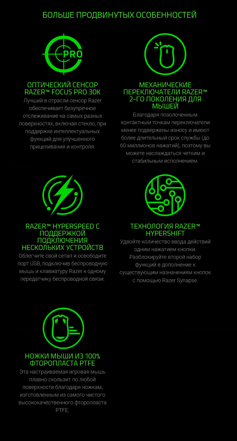 - Оптический сенсор Razer Focus Pro с разрешением 30 000 DPI